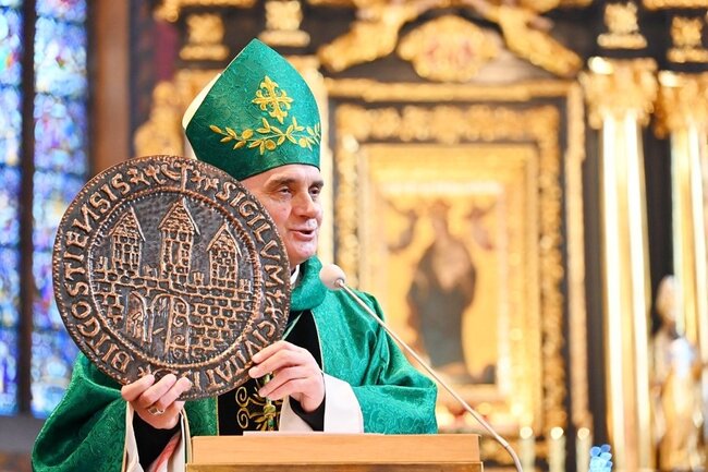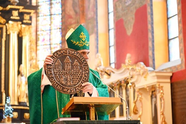 Podczas homilii biskup pokazał sporej wielkości reprint pierwszej pieczęci Bydgoszczy, gdzie oprócz napisów zaznaczony jest krzyż. – Krzyż, który miał swoje miejsce w herbie miasta i przez prawie czterysta lat był obecny, został usunięty krótko przed drugą wojną światową – mówił, przypominając, że wraz z rozwojem chrześcijaństwa to właśnie krzyż stał się naczelnym symbolem tej wiary. – Krzyż, który niesie przesłanie miłości Boga do końca. Dla nas zawsze pozostanie on przypomnieniem ofiary Jezusa, ale też nadziei, że śmierć nie jest ostatnim wydarzeniem w życiu człowieka. Dzisiaj możemy ubolewać, że tego krzyża w herbie brakuje, bo by nam przypominał o tej nadziei, jak i uczył postawy miłości ofiarnej, służebnej, zdolnej do poświęcenia – podkreślił.