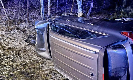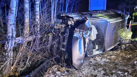 Kierujący pojazdem zjechał do przydrożnego rowu, a następnie uderzył w drzewo. Siła zderzenia była na tyle duża, że samochód zatrzymał się na boku. W chwili zdarzenia w aucie podróżowały dwie osoby, które samodzielnie opuściły pojazd jeszcze przed przybyciem służb ratunkowych.
