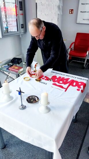 W dniu dzisiejszym na terenie #Solino S.A. odbyła się Msza Święta dla pracowników prowadzących protest głodowy. Eucharystii przewodniczył ks. Robert Różański - proboszcz parafii pw. Św. Trójcy w Górze.