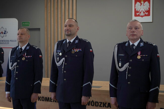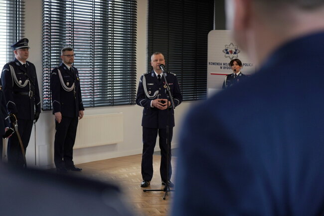 Po wręczeniu odznaczeń Komendant Wojewódzki Policji w Bydgoszczy inspektor Jakub Gorczyński zwrócił się do uhonorowanych słowami: