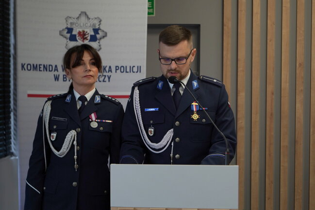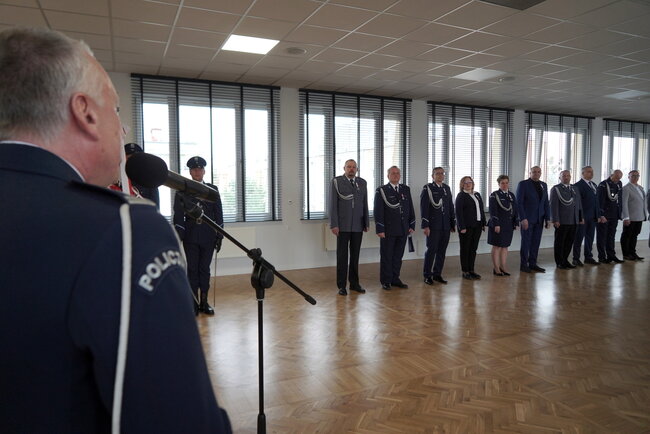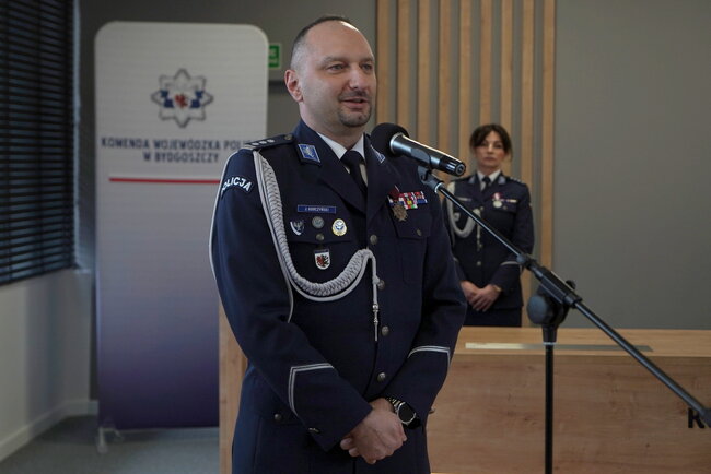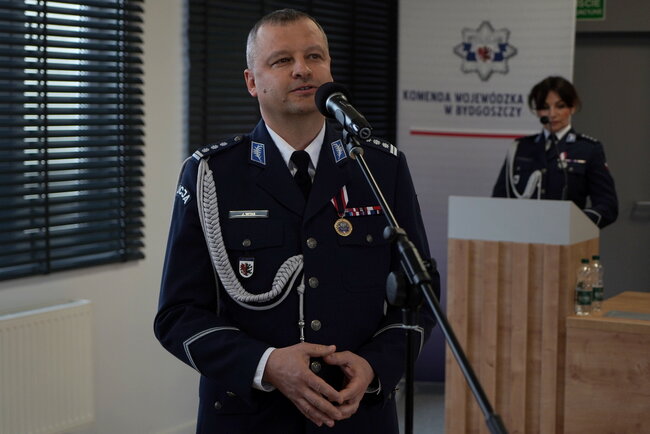 Następnie do zgromadzonych na sali zwrócili się kolejno inspektor Marcin Woźniak i inspektor Jacek Witas - Zastępcy Komendanta Wojewódzkiego Policji w Bydgoszczy, również przekazując słowa podziękowania i uznania.