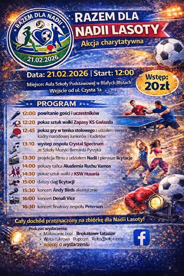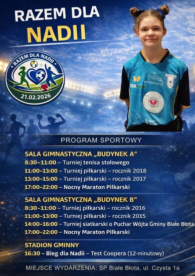 Zbliża się weekend, a wraz z nim wyjątkowe wydarzenie, które łączy sport, #dobrą zabawę i pomaganie. Już w sobotę spotykamy się w Szkoła Podstawowa im. Mariana Rejewskiego w Białych Błotach, by razem wesprzeć Nadię.