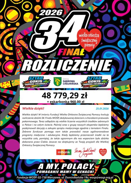 34. final Wielkiej Orkiestry Świątecznej Pomocy już z nami. W gminie Dąbrowa #Chełmińska wspólnymi siłami zebrano 48 779,29 zł + eskarbonka 960,00 zł.