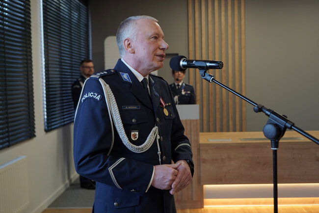 Inspektor Jakub Gorczyński w asyście swoich zastępców i kadry kierowniczej kujawsko-pomorskiej Policji oficjalnie pożegnał odchodzących funkcjonariuszy, zwracając się do każdego z nich indywidualnymi słowami uznania i wdzięczności.